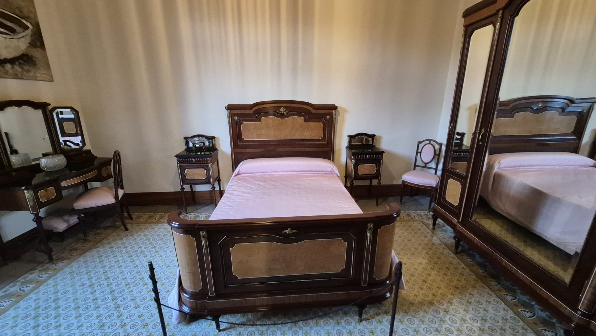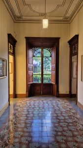 Al entrar en la casa, nos cautivaron los suelos de baldosas hidráulicas, cada estancia con un diseño único. Restauradas en 2013 por Huguet de Campos junto a artesanos marroquíes, estas piezas de 20×20 cm parecen alfombras gracias a la precisión de sus patrones, cumpliendo el deseo de los fundadores de dar a cada habitación una identidad propia